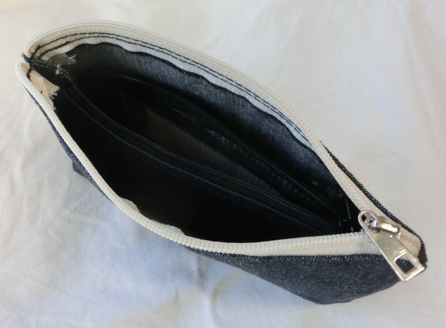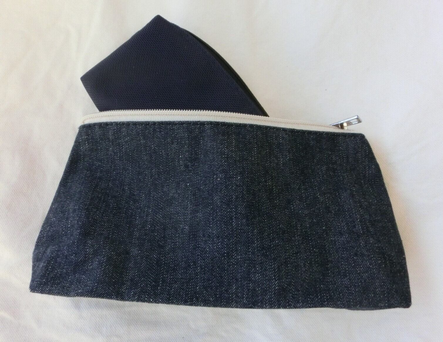 入れ子式になっているペンケースです。それぞれ別々に使うこともできます。 レースが縫い付けてあります。デニム地で作られているので丈夫です。
